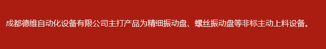 成都德维自动化设备有限公司是一家专业生产振动盘的企业,成立于2017年3月,位于成都市郫都区现代工业港南区和聚工业园2459号,注册资金100万,现有员工20余人。公司主打产品为精细振动盘、螺丝振动盘等非标主动上料设备,商品包含:各种主动拼装设备、电子零件加工设备,电子元器件及五金小零件主动上料振动盘系列以及与之配套运用的主动送料仓、直线送料器、控制器、振动渠道、垂直振动器系列及非标自动化设备等,广泛应用于电子、五金、塑胶、连接器、医疗器械、医药、日常用品的制造等各个行业,是解决工业自动化设备供料的必须设备。